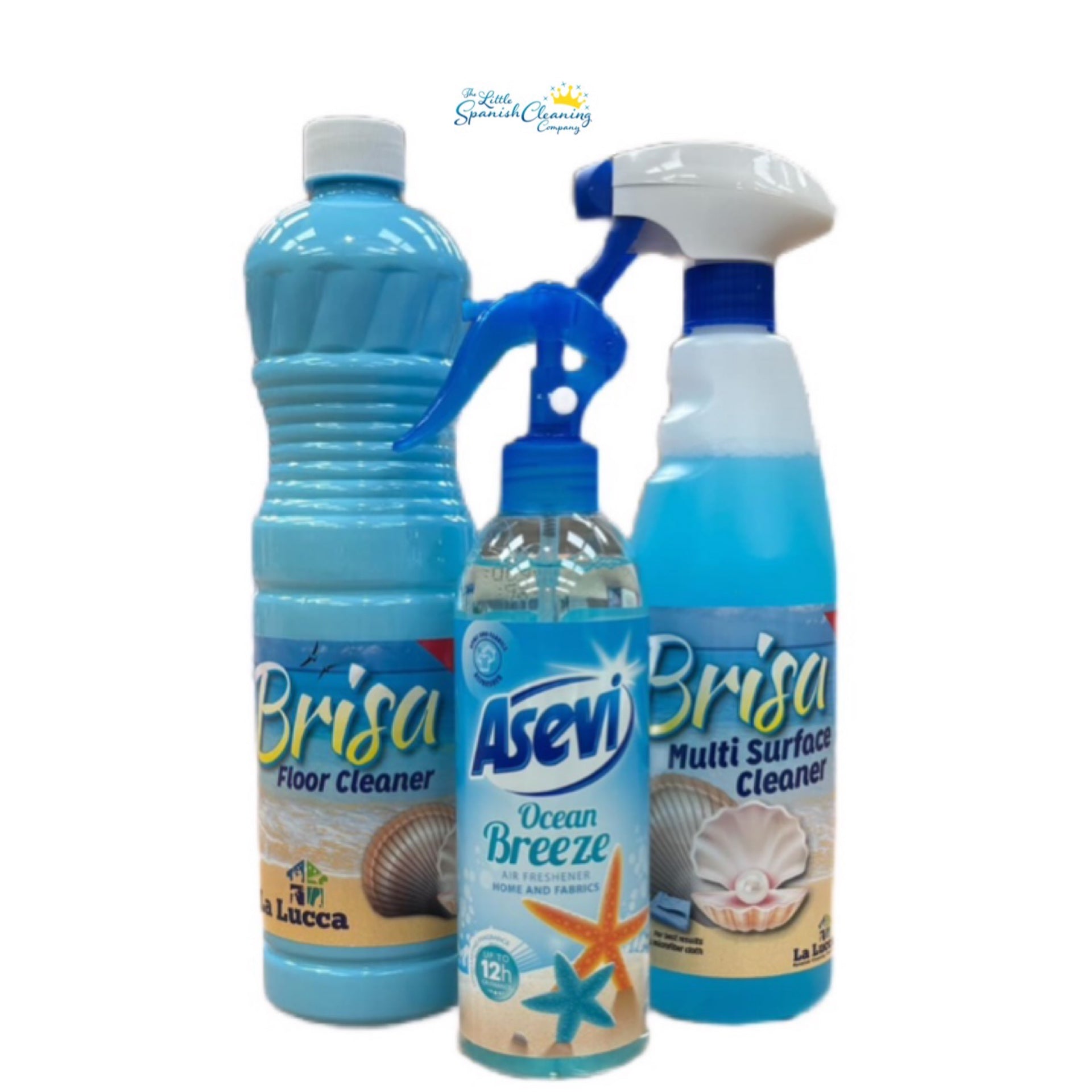 Introducing the Brisas fresh breeze scent cleaning combination, a complete cleaning solution for your home. This product includes a floor cleaner, multisurface spray, and room and fabric spray mist, all designed to provide a refreshing and long-lasting scent while effectively cleaning your home.